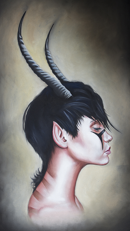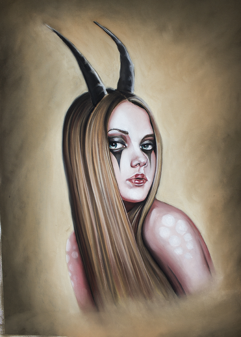 - Fine art painting: woman with horns, long hair, stark makeup