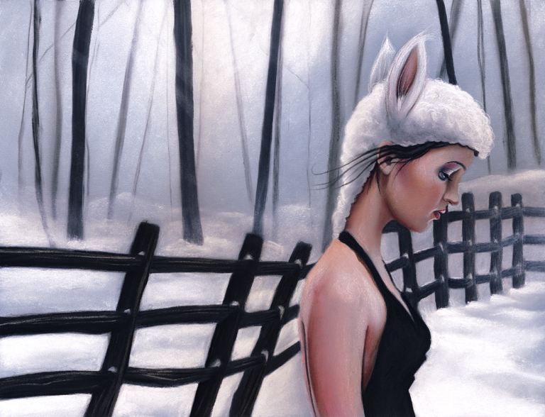 - Woman in white bunny hat and black dress in snowy forest